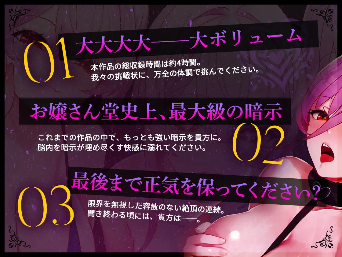 多重愛撫のスウィート・トランス -甘い罠の世界にようこそ-(男性向け) 催眠 2026.01.23 催眠 2026年DLsite専売お嬢さん堂トランス/暗示ボイス快楽堕ち精神支配耳舐め藤村莉央複数プレイ/乱交言葉責め逆レ連続絶頂 サークル「お嬢さん堂」のR18音声作品です。 四方八方から絶え間なく響く声に対し、貴方ができるのは耳を傾けることだけ。──でも大丈夫。貴方は声に集中するだけでいい。それだけで至高の、壊れてしまうほどの快楽を得られます。限界を迎えてもなお詰め込まれる快感に、貴方は最後まで耐えることができますか? 声優:藤村莉央 タグ:トランス/暗示ボイス 連続絶頂 快楽堕ち 逆レ 言葉責め 精神支配 複数プレイ/乱交 耳舐め この作品のダウンロードはこちら この作品のダウンロードはこちら