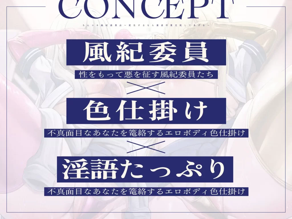 性をもって悪を征す風紀委員たち が不真面目なあなたをエロボディで色仕掛け。童貞を殺す心情代弁と嘘喘ぎのオンパレードに浸りやがれください。「むっほぉ~♡ きんもちぃ~♡ デカパイメスJKサポートのオナホまんこ気持ちよすぎ~♡ 童貞には刺激がちゅよいよぉ~♡「ちんぽにオナホ♡耳にエロキスぅ♡ こんなの無理ぃ~♡ こんなドスケベハーレム状態でイケメン腰振り無理に決まってんだろぉ~♡」