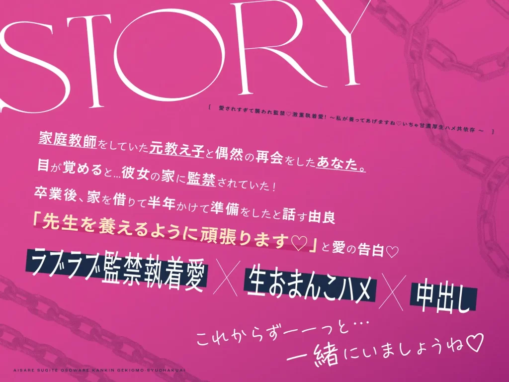 元教え子と偶然の再会、そして監禁♡「先生を養えるように頑張ります♡」と愛の告白♡ 誘惑手コキ・耳舐め好き好き連呼・甘々キスハメ…エッチで可愛い女の子に重いくらいに愛されまくり!! 愛情たっぷり×濃厚えっち×生ハメ中出し 夢のような監禁生活をお楽しみください♡