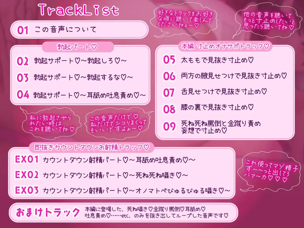 【マゾ向け淫語囁き特化♡見抜き♡射精禁止煽り責め♡サクッと寸止めできちゃうオナサポ音声短編集♡】女の子様にオナニーしているところを徹底的にバカにされたいド変態マゾ向けのサクッと聴けるオナサポ音声短編集です♡エッチでドSで蒸れ蒸れな女の子様のセリフ付きフルカラーCGイラスト特典もたっぷり65ページ♡「寸止め好きのマゾはぁ…♡私の声とカラダで♡その雑魚チンポをず~~っとコいててくださいねぇ~~♡♡♡」