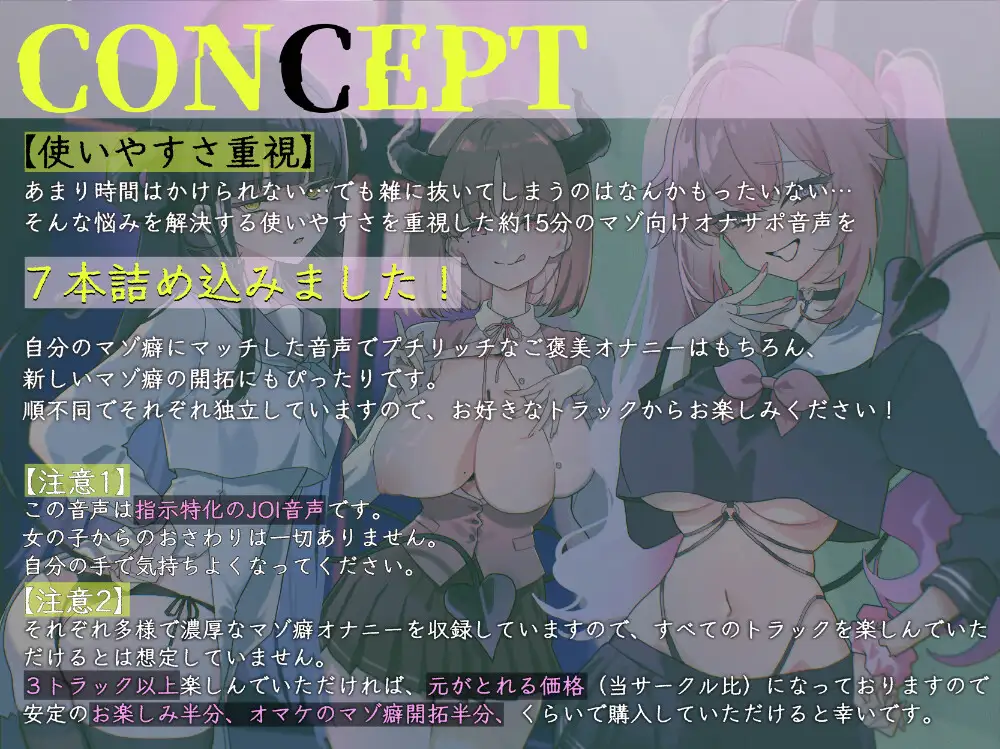 忙しいマゾのために作られた約15分のオナサポ音声7本セットです。かわいいサキュバスたちのマゾ犬ペットになってたくさん搾精されちゃいましょう。床オナ、オナホ、スパンキング、乳首開発、ローションガーゼ、野外露出、おもちゃ責め、焦らし、罵倒、嘲笑、甘やかし…自分のお気に入りのマゾ癖を悪化させるのはもちろん、新しいマゾ癖の開拓にもぴったりです!順不同なので好きなプレイを好きなだけ楽しんでください。
