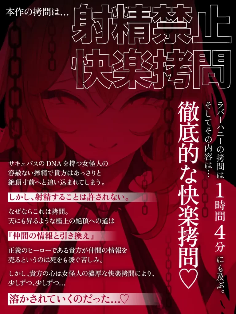 新人ヒーローのあなたは悪の組織「マッド・ヴィーナス」との戦闘に敗れ、組織のアジトへと連行された。あなたの前に現れたのはサキュバスのDNAを持つ怪人「ラバーハニー」。ヒーロー組織の情報を吐くよう促す彼女。しかしあなたはおいそれと首を縦には振らない。そんなあなたの唇に、怪人の唇が迫る。そう、彼女の○問は「快楽○問」。サキュバスの肉体を使いあなたを追い込む。しかし、突然止まる彼女の動き。「射精は快楽と引き換えよ♡」