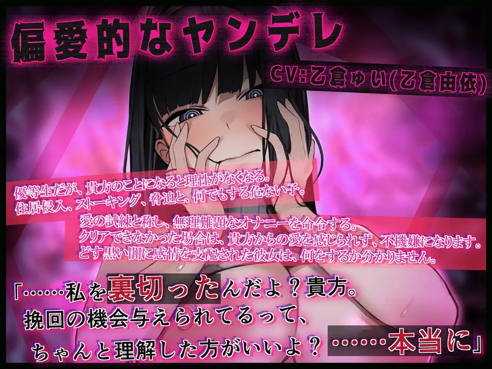 ヤンデレに滅茶苦茶ハードなオナサポをさせられる音声です。地獄のような重すぎる愛を囁かれながら、課題をクリアしましょう。